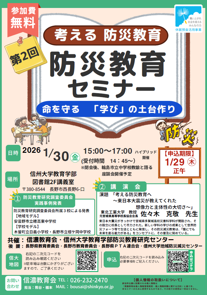2026年1月30日(金)15時から、信州大学教育学部図書館2階講義室にて、「第2回防災教育セミナー」を開催いたします。