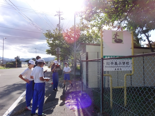 10月20日(月)、防災アドバイザーの皆さんにサポートいただき、「川中島の防災マスターになろう」と題し、フィールドワークを行った。 地震や水害の時に危険な場所や安全な場所、役に立ちそうなものなど調査の視点を確認し、グループに分かれ調査にでかけた。グループごとに、発見したことをフィールドオンアプリに、写真で記録し、気づいたことをタブレットのメモに書き込んでいった。